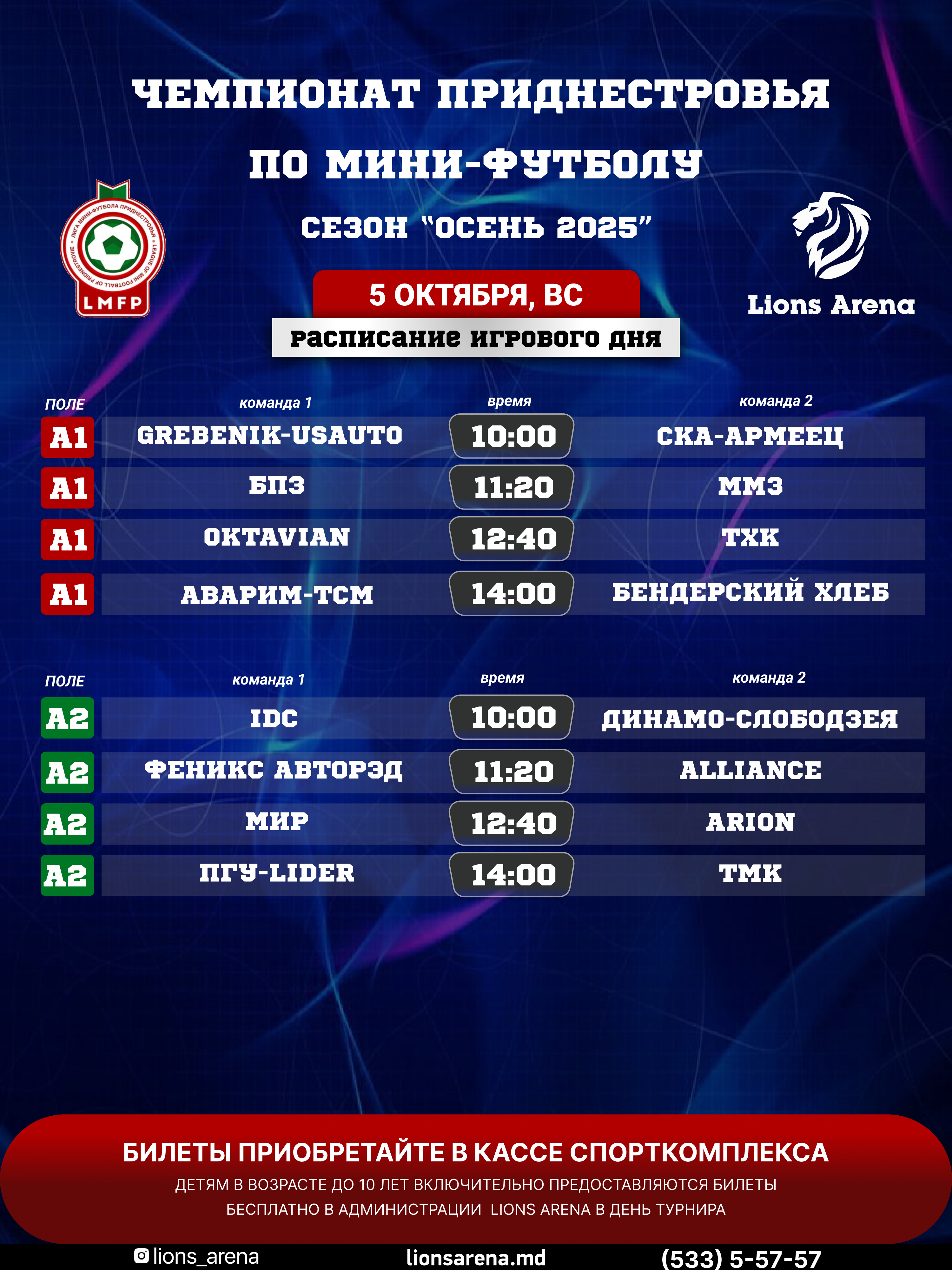 Чемпионат Приднестровья по мини-футболу + Добавить в Google Calendar + iCal / Outlook export Дата Окт 12 2025 Expired! Время 11:00 - 16:00 Поделиться событием